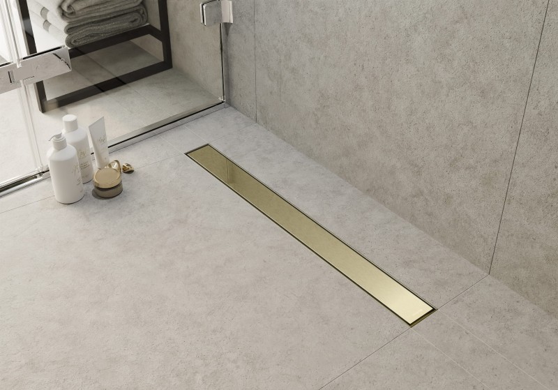 Odpływ liniowy 2w1 pozwala na dwojakie zastosowanie. Potrzebujesz utrzymać w łazience styl klasyczny? Zastosuj standardową stronę rusztu w kolorze złotym szczotkowanym. Chcesz uzyskać efekt niewidocznego odpływu pod prysznicem? Obróć ruszt i wklej płytkę w puste miejsce, a Twój prysznic nabierze nowoczesnego charakteru. Przy ściankach prysznicowych typu walk-in polecamy minimalistyczny odpływ liniowy pod płytkę.